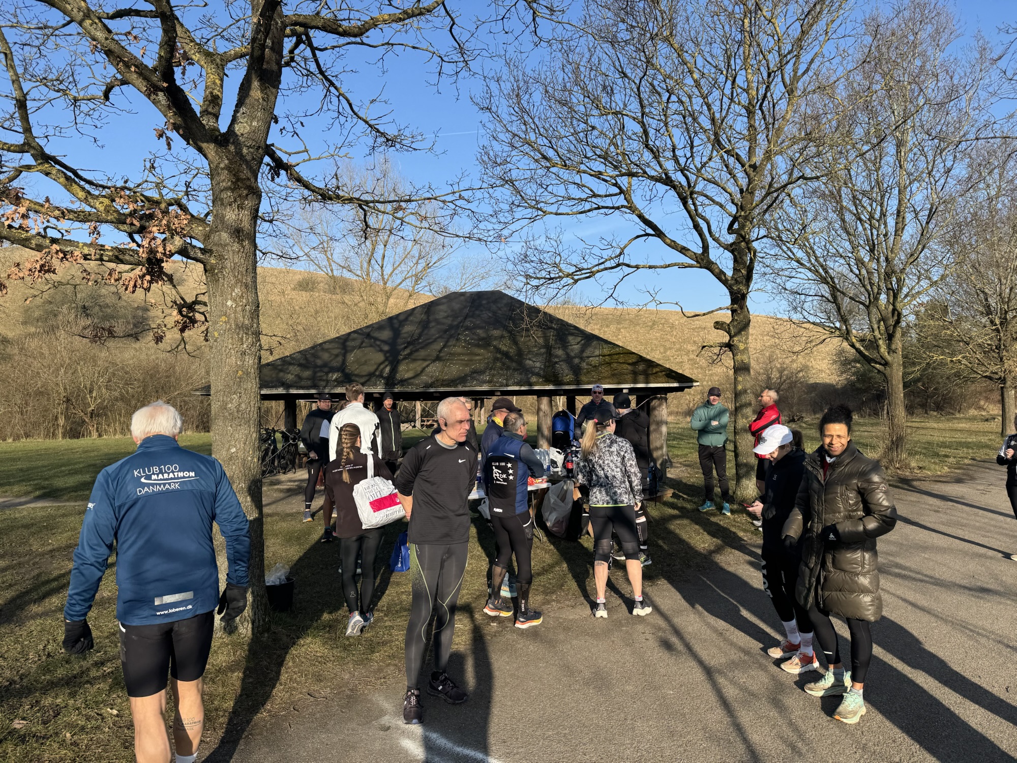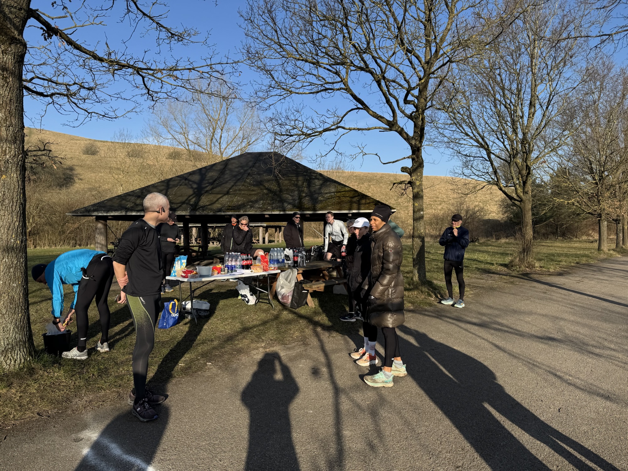 Vi mødtes i morges kl. ca. 8, Mandys kæreste Jakob var på cykel ude og markere ruten med spray-pile på jorden. Ruten var 6.95 km og skulle løbes 6 gange på marathon og 3 gange for halvmarathon – og så var der for begge distancer epilog med en tur op på toppen af Herstedhøje. Derudover kunne man løbe runder.