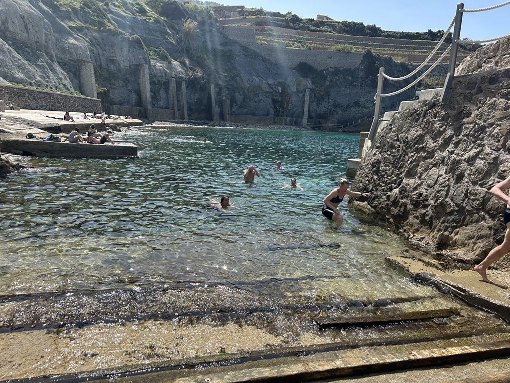 Ca 10-15 min gang fra byen var det muligt at blive skyllet i Middelhavet, så vi begav os afsted – nedad – og fandt i hyggelig lille bådbugt hvor vi fik et virkelige forfriskende dyp. Vi havde ikke mulighed for bad før hjemrejsen, så min pakkede rygsæk med skiftetøj var kærkommen. Det var så lækkert!