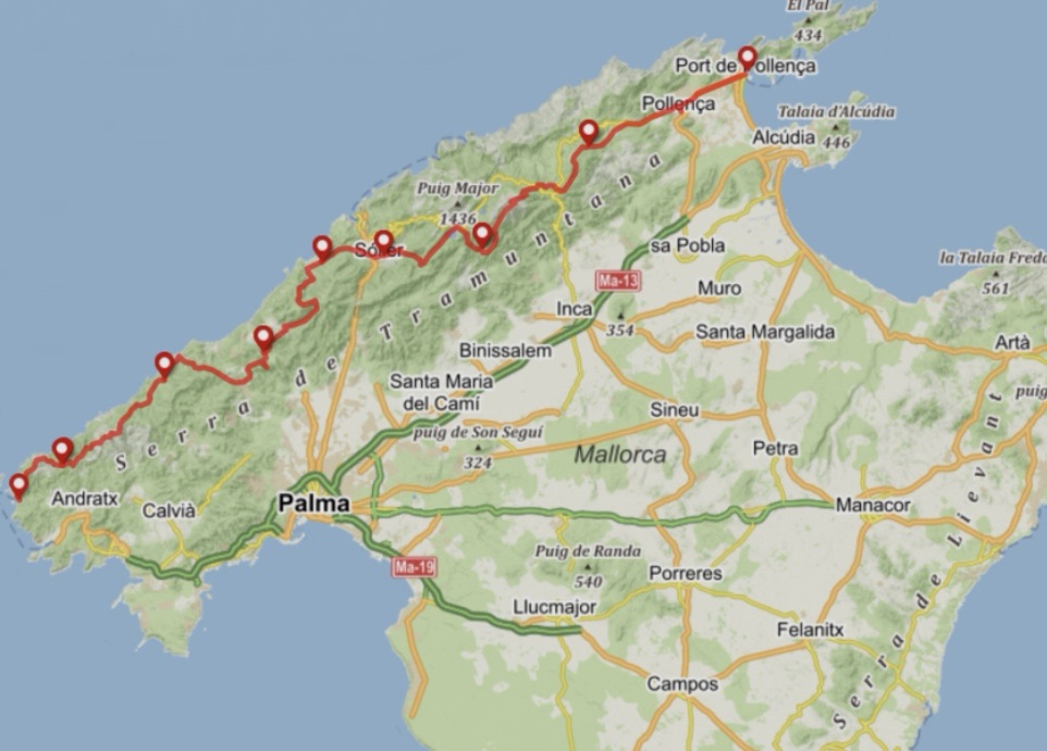 På kortet kan ruten ses, hvoraf vi løb fra Pollenca til “den 3. sidste prik” på kortet. Der er stadig så mange indtryk som skal bearbejdes. Der dukker nye detaljer op for mit indre. Jeg har sovet som en sten hele ugen og først i dag været ude på en lille 7.5 km tur. Mine knæ er ømme. Var hos osteopat i onsdags og håber Lotte har fået tryllet inden den på søndag står på Ø-Marathon på Amager, efterfulgt af hygge og frokost hos yndlings Stine M.