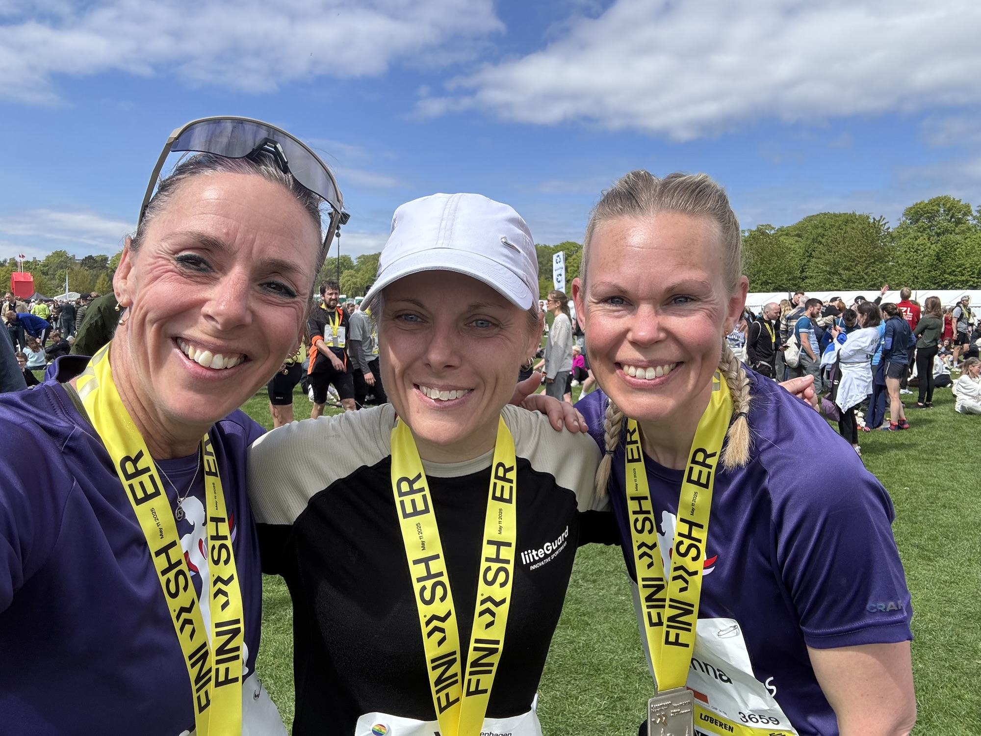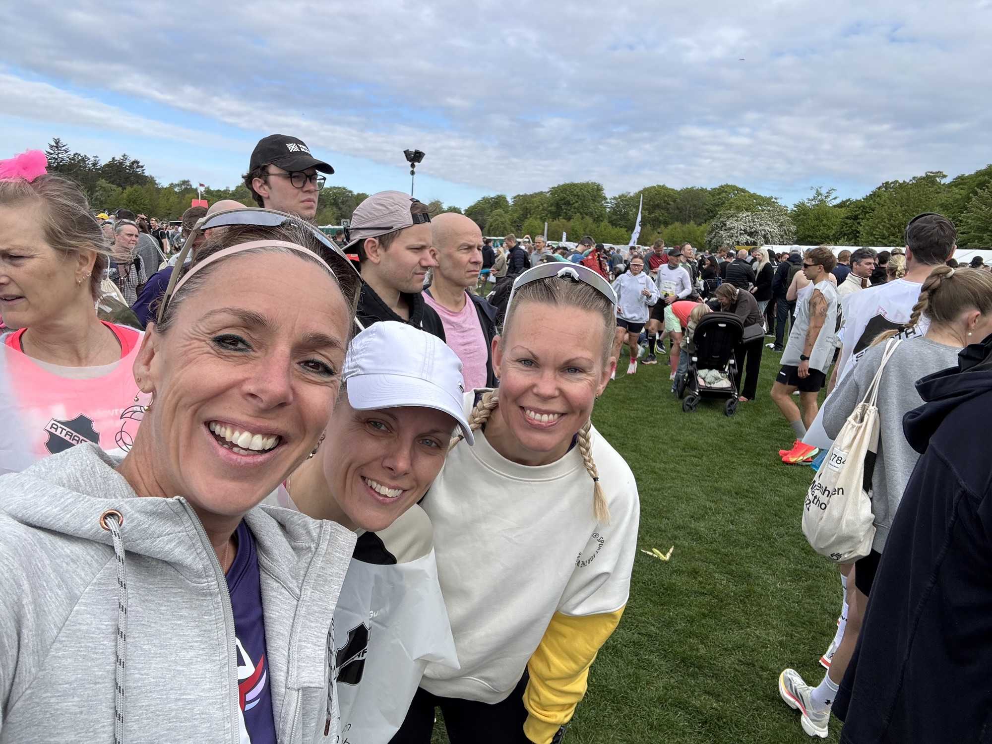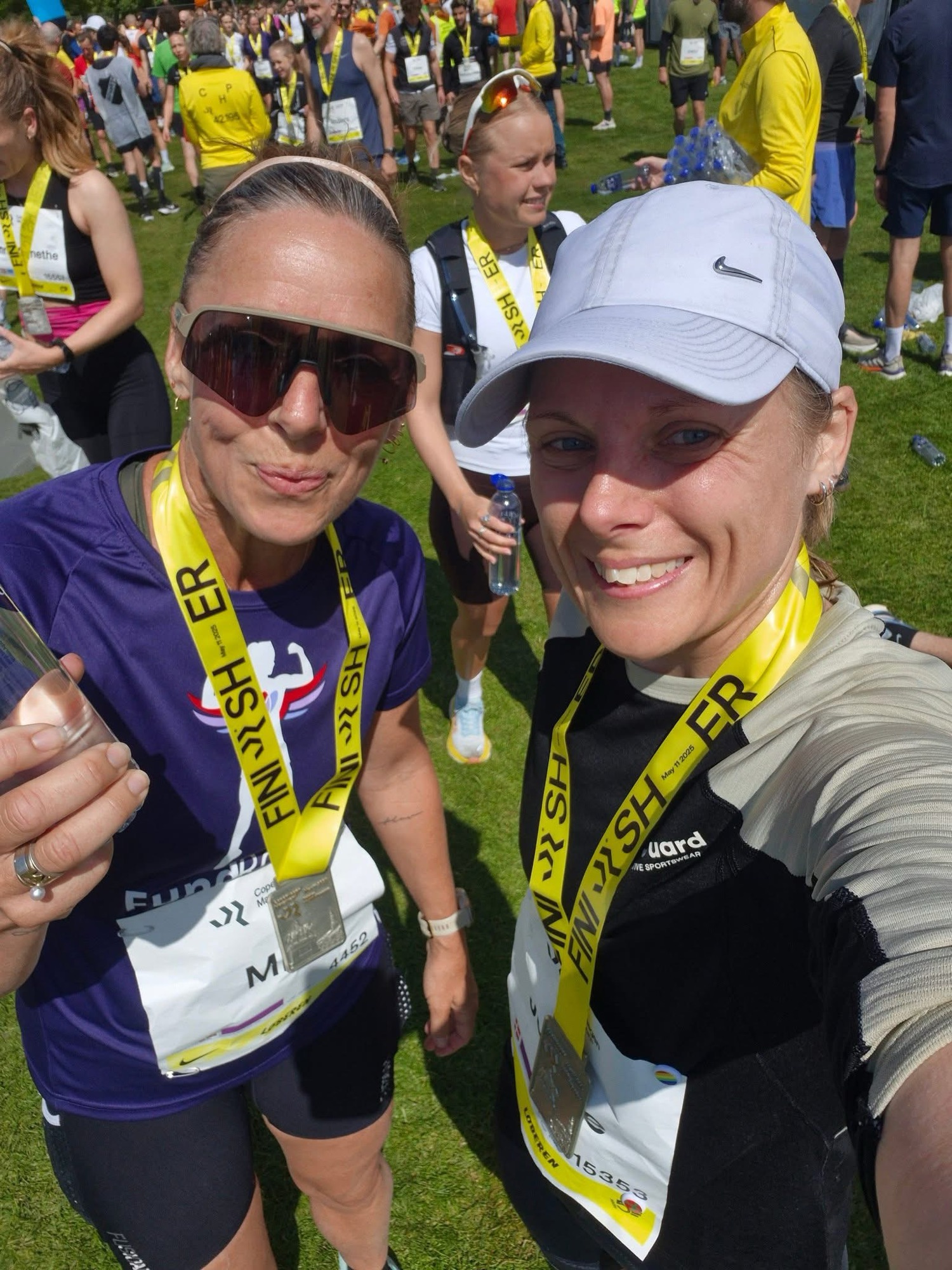 Min søs, min ældste datter Liva og flere venner af min søs, stod klar på målstregen men vi fik ikke set hinanden. Lige efter mål ringede Nanna heldigvis og sagde at hun havde brugt 1/2 minut på at sunde sig og så fundet sit eget tempo og var kommet i mål på 3.59.49, så stærkt kommet igen. Jeanne og jeg var inde 4 1/2 minut før, så det var perfekt.