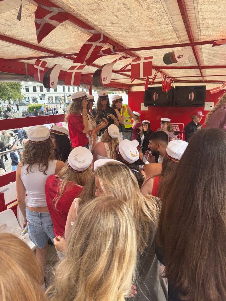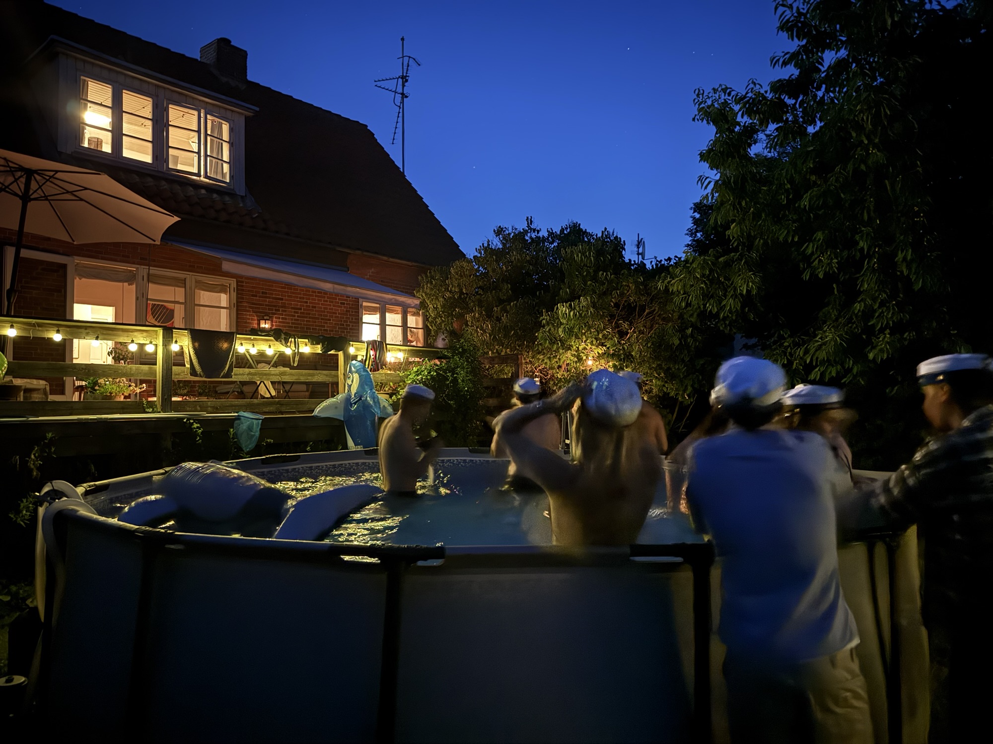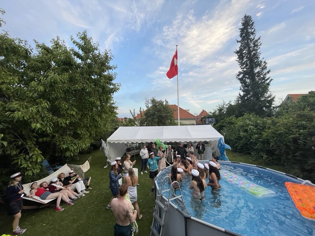 Carla havde ønsket “pool-tema” til vognstoppet, som var udvidet i tid pga chaufførens aftenpause. Det betød, at vi havde 30-40 minutter. Det var verdensklasse, og vi talte 13 studenter i poolen samtidig – i gang med at få enten “ubåden” (et hak til huen fordi man har taget en ølbong under vand) eller en selvopfunden “skildpadde” (hvor man sad på badedyret og tog en bong). Det er så tosset, og jeg elsker det.