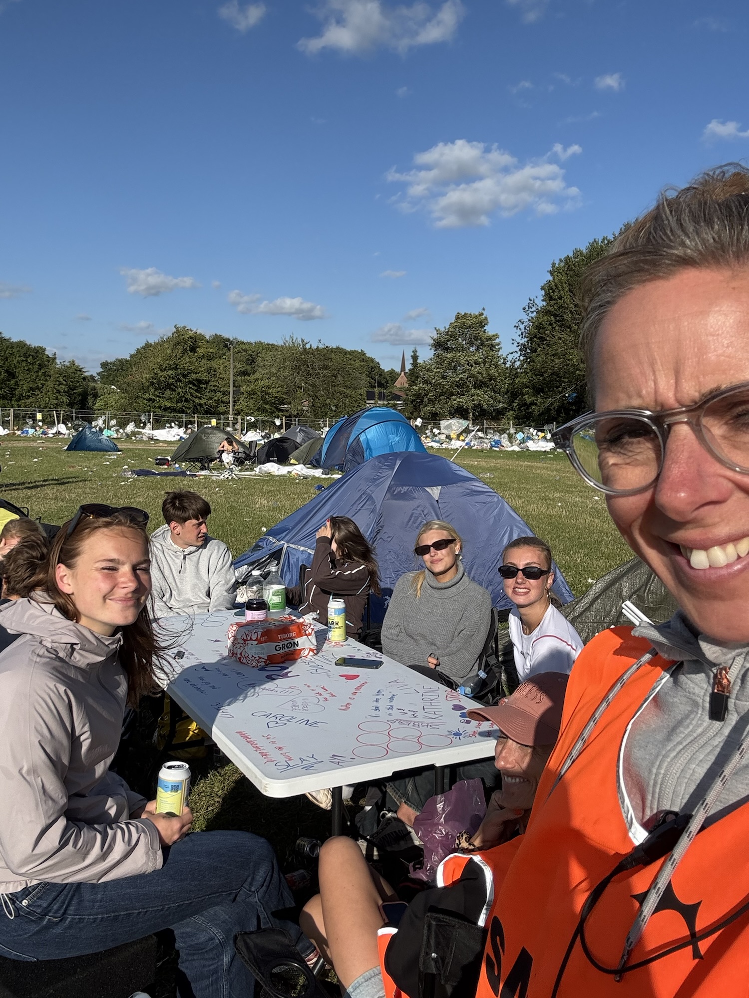 Lørdag sluttede vi med endnu en nattevagt (på piller) hvor vi primært var på “flow” dvs hjælper med at styre menneske-masserne mellem koncerter. Først lukkede Orange med Tyla, så Arena med Noah Carter og så festivalens allersidste show med A.G. Cooks på Apollo en scene der består af containere og hvor alle gerne vil ind og have det allersidste med. Trætte, stive og høje. Det blev en lidt voldsom omgang, hvor jeg måtte bede alle om at træde et skridt tilbage og fik grumme reminders til år 2000 og Pearl jam koncerten netop 25 år efter. Der var virkelig pres på men plads nok, alle var bare meget ivrige efter at komme i den samme kø ind.
